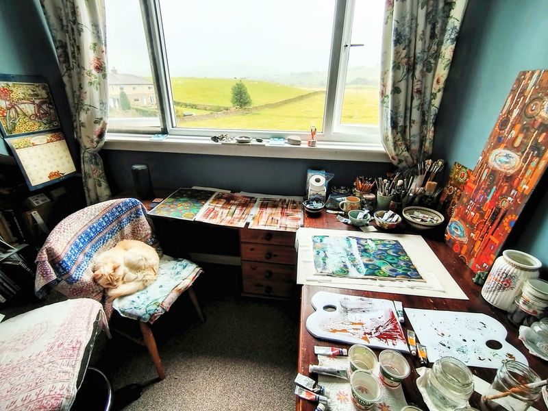 This is my Creative Space, my constant companion Harls, and the south facing view for which I am forever grateful.